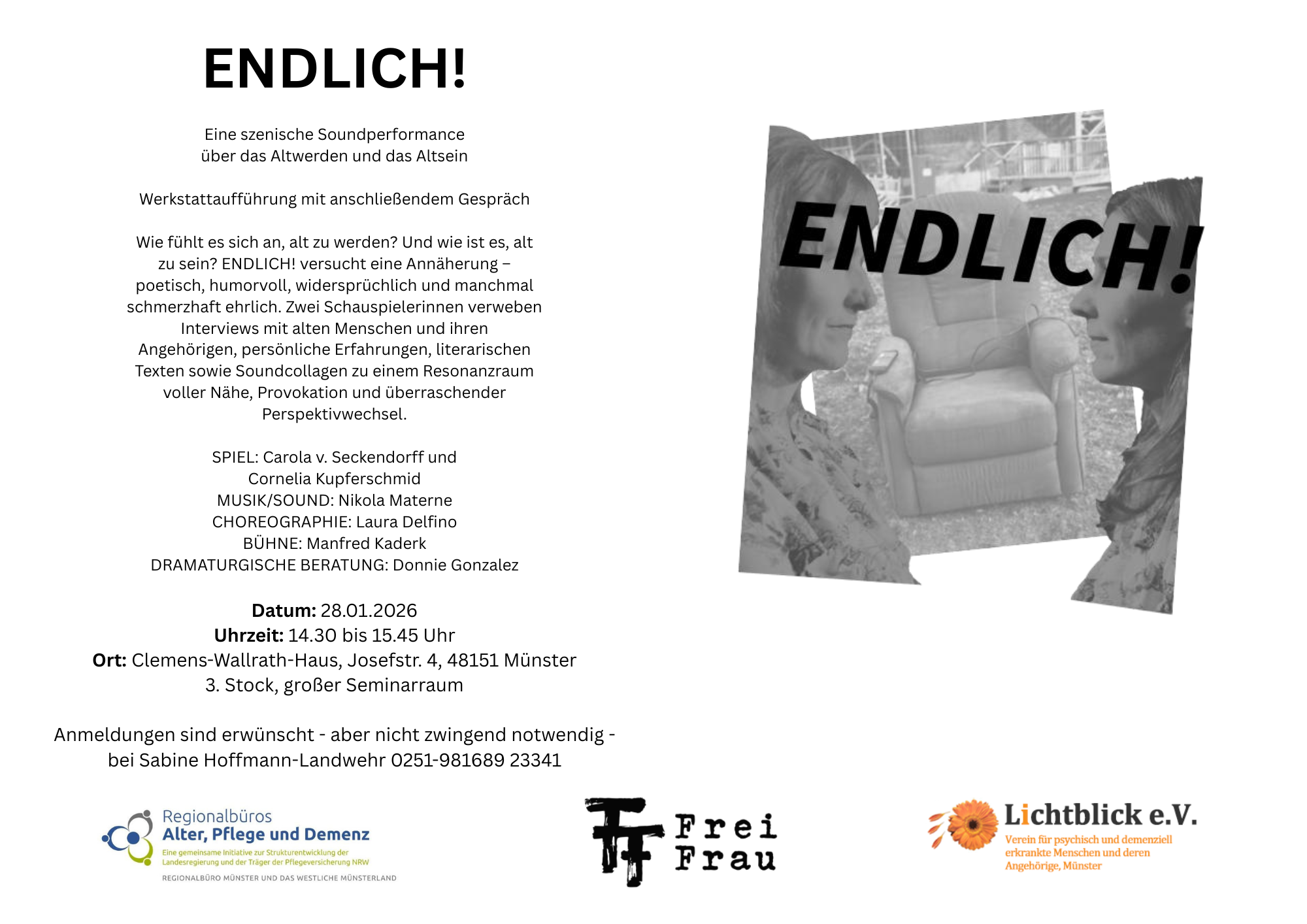 Wie fühlt es sich an, alt zu werden? Und wie ist es, alt zu sein? Mit diesen Fragen beschäftigt sich die szenische Soundperformance ENDLICH!, die am 28. Januar 2026 von 14:30 bis 15:45 Uhr im Clemens Wallrath-Haus in Münster als Werkstattaufführung mit anschließendem Gespräch gezeigt wird.